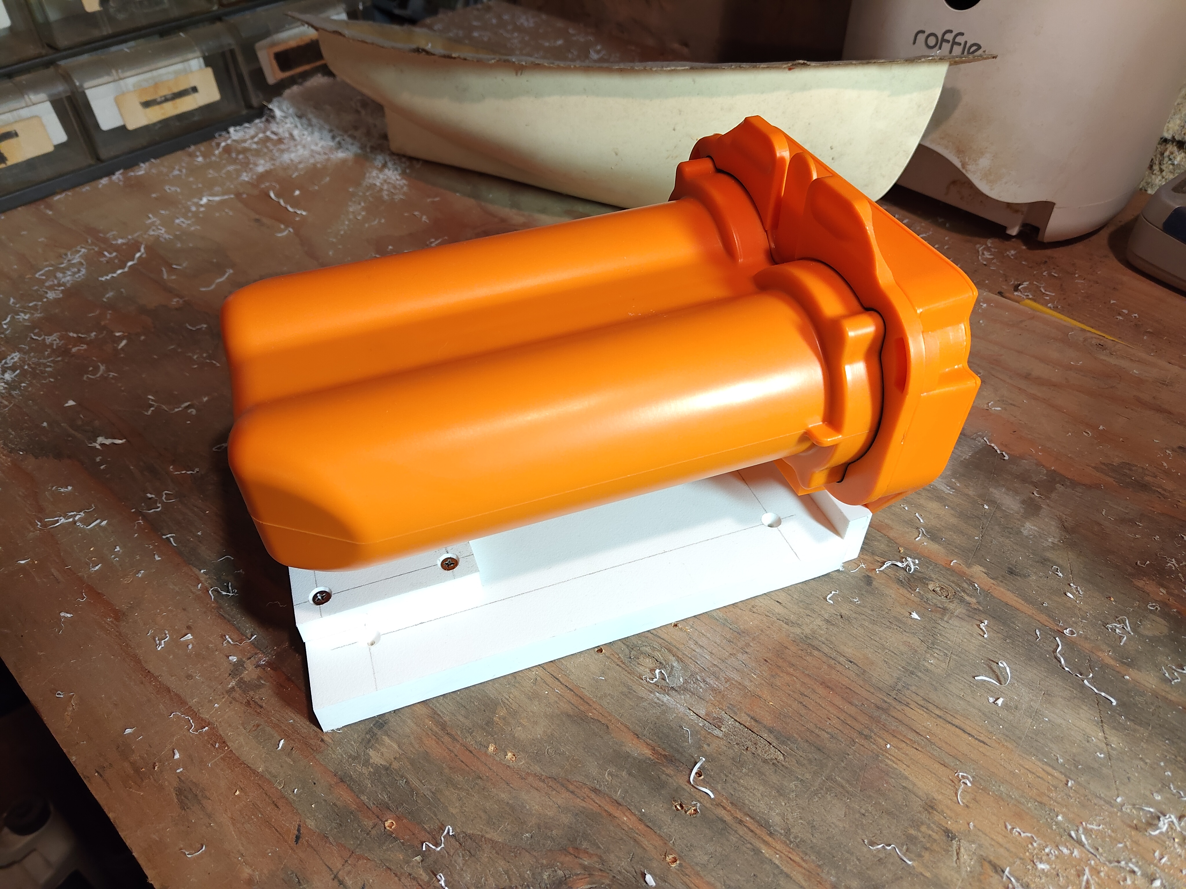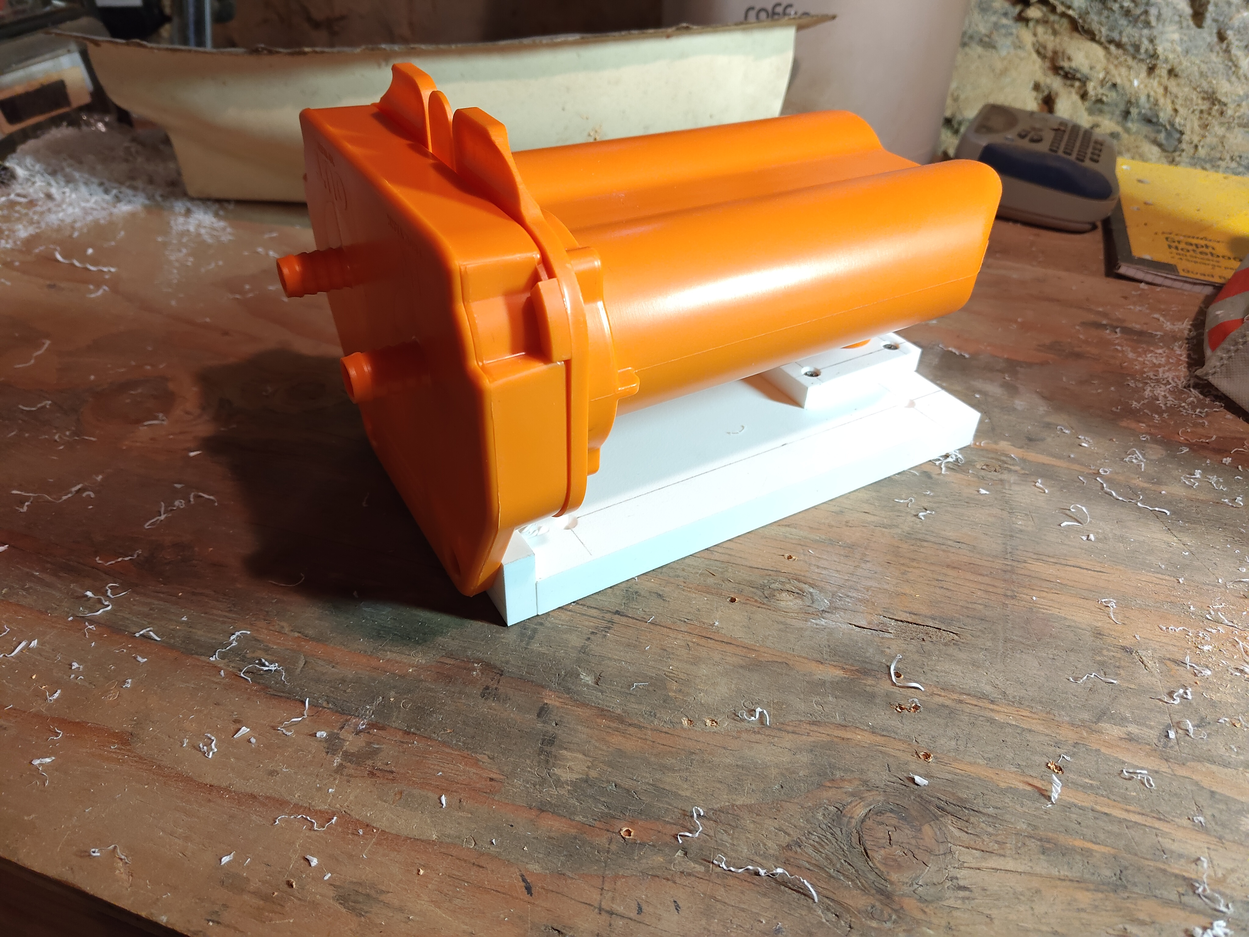 I bought a big orange filter for my waste tank. I don't have good access to the tank, so today I built a bracket to surface mount the filter to the firewall.