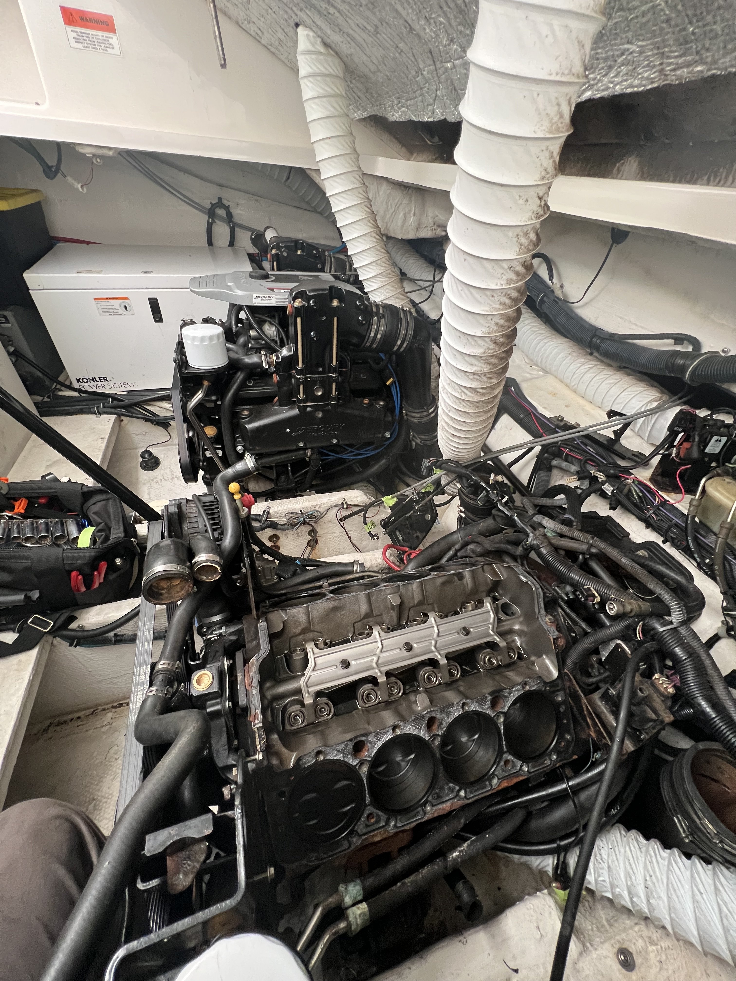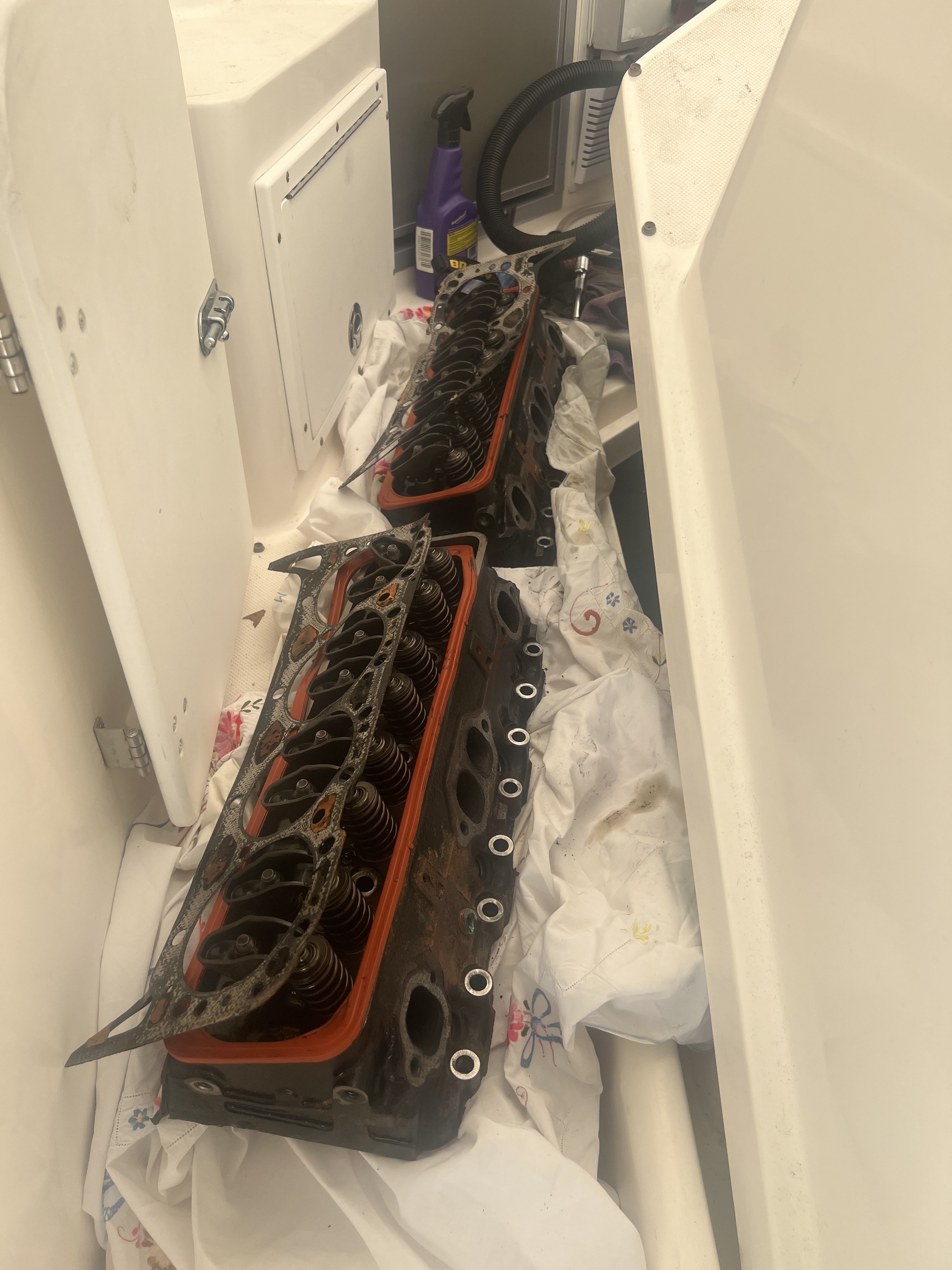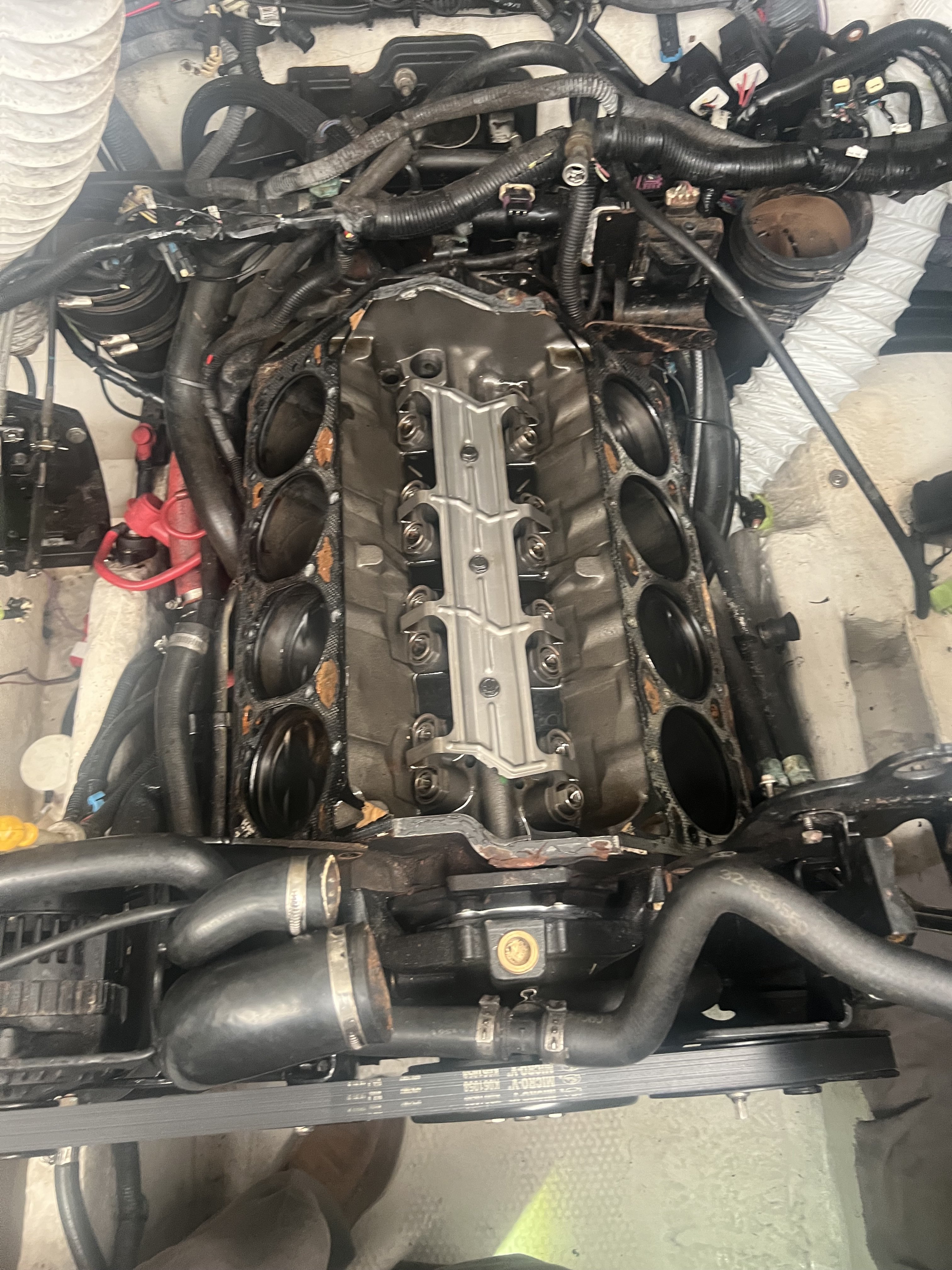 2 weeks ago I was backing into a slip and heard a ticking sound on the port side. When I got into the slip I put her in neutral and didn’t hear anything. Reved a little and still no sound, same with bumping her into forward. Leaving to head back to home dock she jumped up and took off with no issues. Power seemed good, I didn’t want to firewall her just in case there was an issue. Next weekend we head out and all seemed good again, this time I gave more power and the port engine seemed like it didn’t want to go over 4000 RPM’s. I pulled back a little and tried again, this time she went up to around 4300-4500. Something didn’t seem right. Back at the slip I noticed a slight vibration on the port engine at idle. Decided to pull her, we had a great season and my daughter’s schedules were getting busy so it was a good time to pull her anyway. Pulled her on Monday had her shrink wrapped on Wednesday and today I started to dig in! No compression on the # 1 cylinder! Pulled the valve covers and all looked good. Stuck a borescope in the plug hole, piston and cylinder all looked great. The piston head did look super clean, could be a head gasket. I could only see half the valves, tough to tell but I don’t think the exhaust valve was fully seating, could be tuliped. Pulling the heads off to take a deeper look at it. More pictures to come in the following weeks.