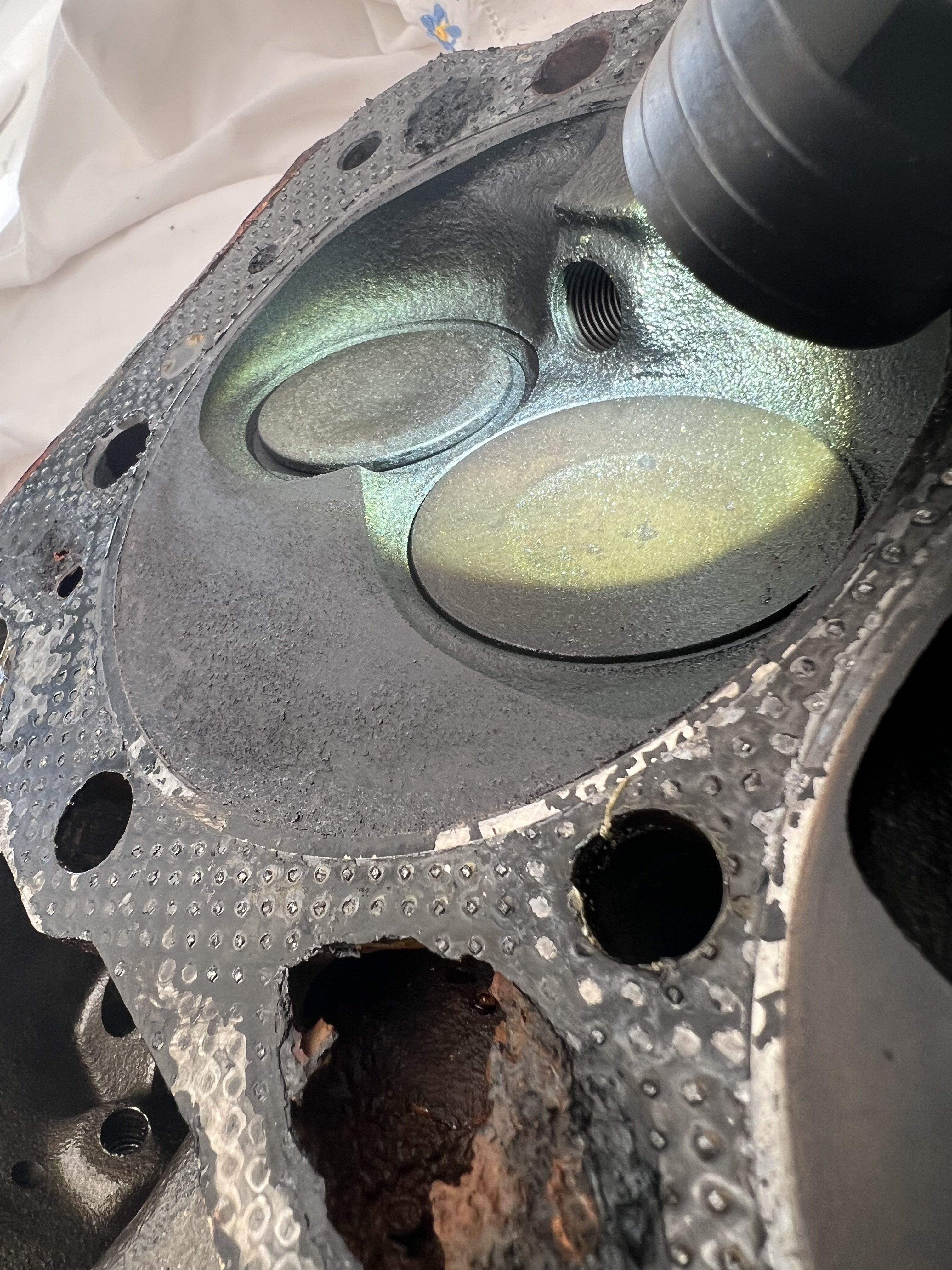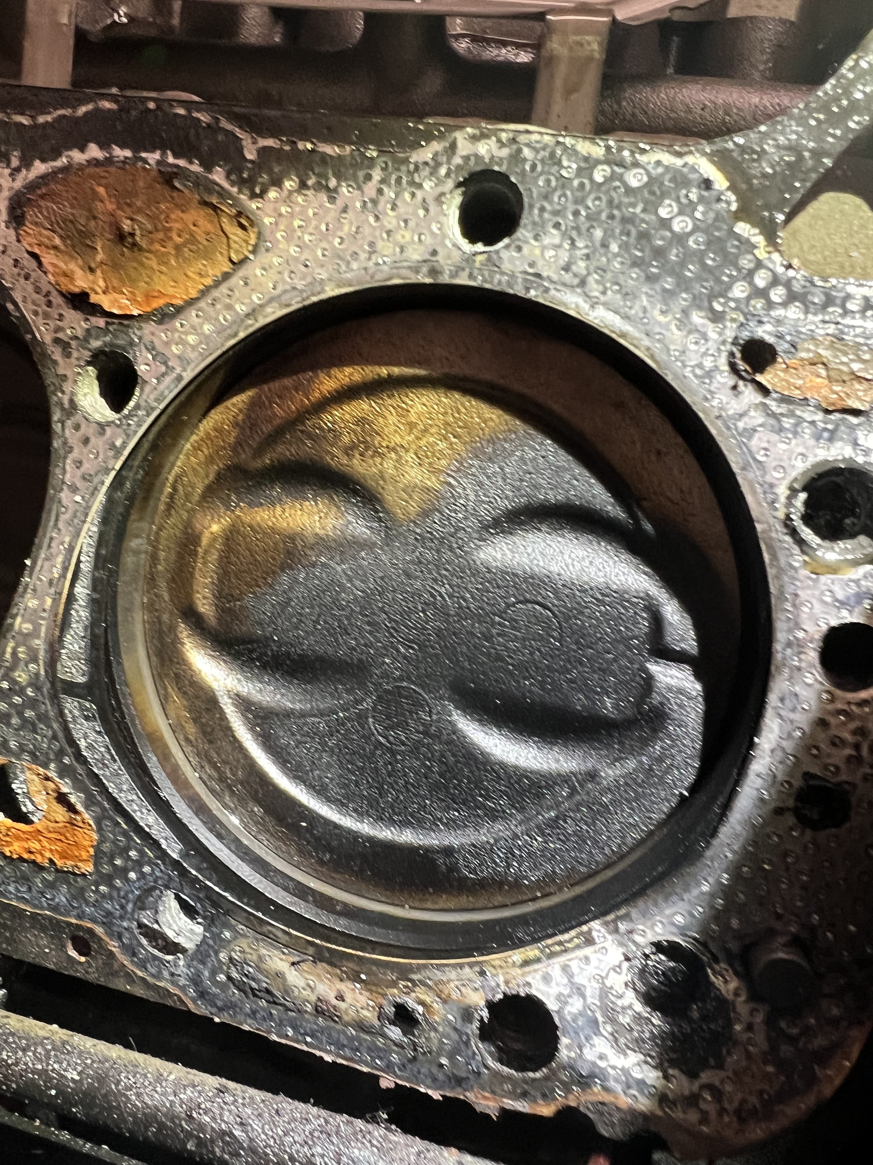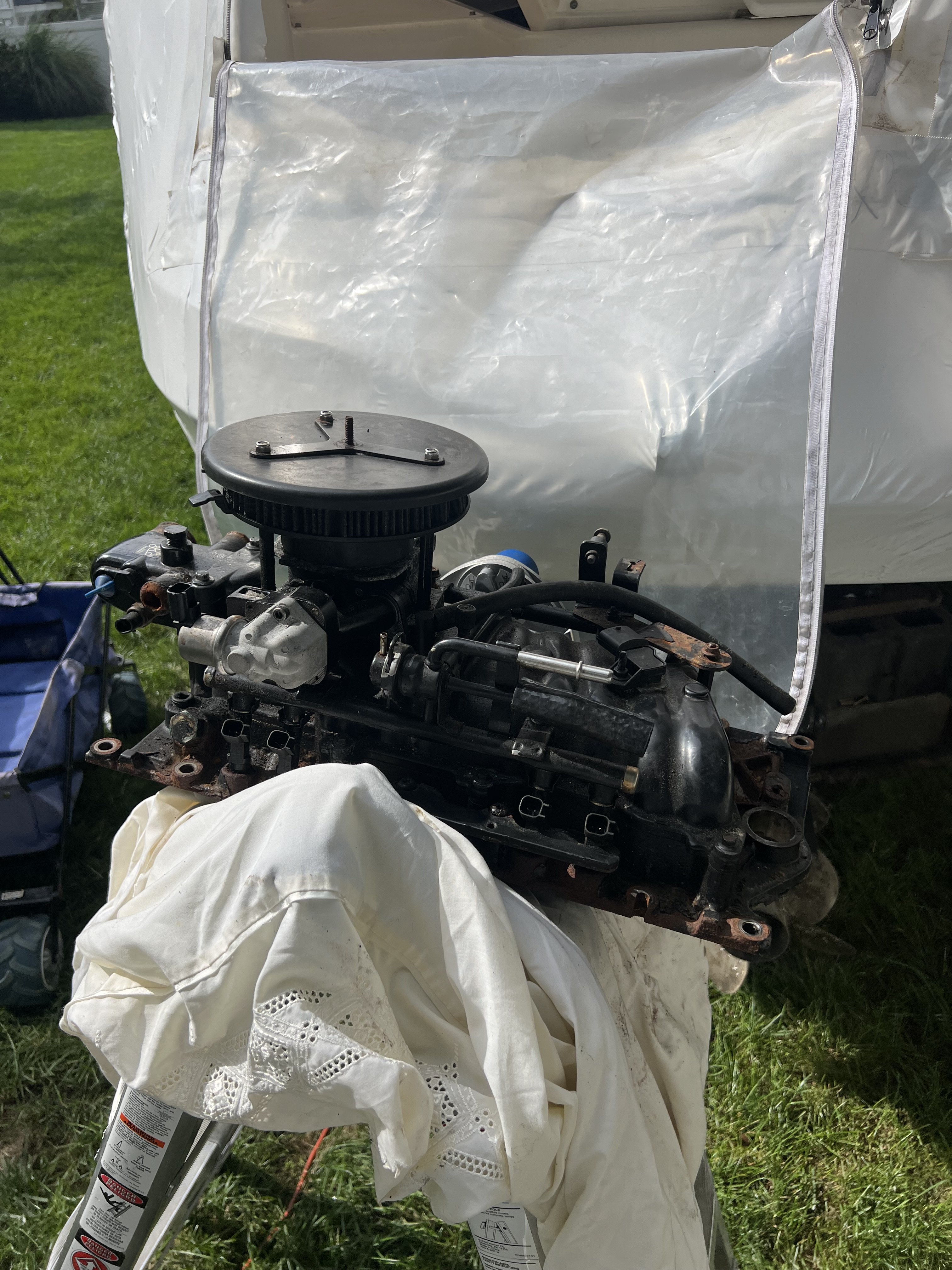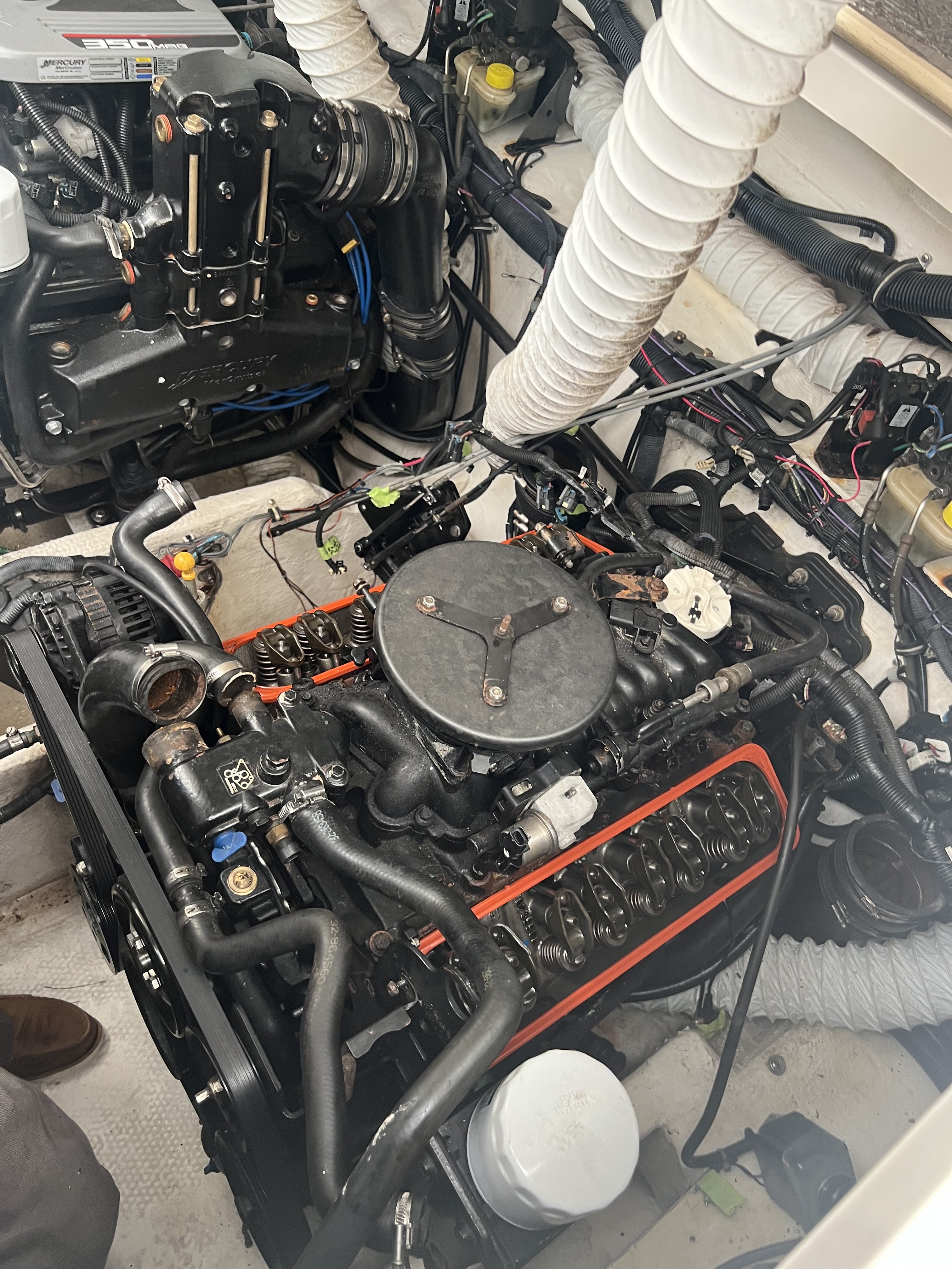 2 weeks ago I was backing into a slip and heard a ticking sound on the port side. When I got into the slip I put her in neutral and didn’t hear anything. Reved a little and still no sound, same with bumping her into forward. Leaving to head back to home dock she jumped up and took off with no issues. Power seemed good, I didn’t want to firewall her just in case there was an issue. Next weekend we head out and all seemed good again, this time I gave more power and the port engine seemed like it didn’t want to go over 4000 RPM’s. I pulled back a little and tried again, this time she went up to around 4300-4500. Something didn’t seem right. Back at the slip I noticed a slight vibration on the port engine at idle. Decided to pull her, we had a great season and my daughter’s schedules were getting busy so it was a good time to pull her anyway. Pulled her on Monday had her shrink wrapped on Wednesday and today I started to dig in! No compression on the # 1 cylinder! Pulled the valve covers and all looked good. Stuck a borescope in the plug hole, piston and cylinder all looked great. The piston head did look super clean, could be a head gasket. I could only see half the valves, tough to tell but I don’t think the exhaust valve was fully seating, could be tuliped. Pulling the heads off to take a deeper look at it. More pictures to come in the following weeks.