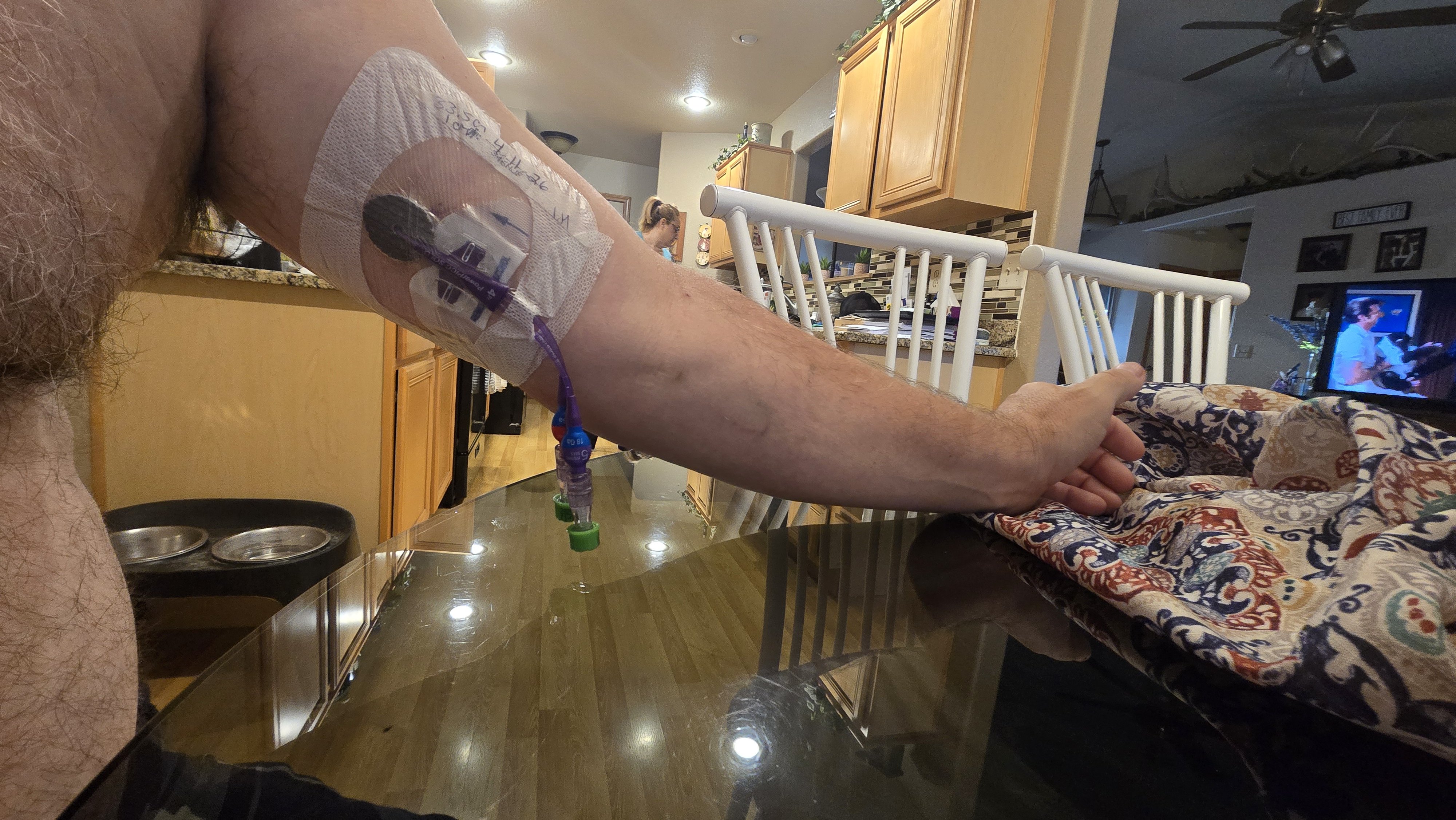 My absence from the Rinker page for the past month comes with a serious reason for me. I am in the fight of my life, against a gnarly Staph infection! I got infected from a simple Cortisone injection, for something minor. That quickly spiraled out of control. I'll share a few pictures, so viewer beware! Nothing gross, but it's pretty extreme. The two of my hands represent good hand/bad hand. My entire arm looked like this and was FULL of Staph. The other picture is my reality for 6 weeks what I'm facing. A 47cm (18.5"!) IV pickline that goes in my bicep, and curls up and around to end straight in my heart. Every 8 hours for 6 weeks, I'm getting IV antibiotics.
