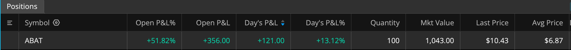 Gotta love sitting at a bar on Friday, after the big drop in the market, all angry at the red numbers on the screen.. and a friend says "hey I've been telling you about ABAT, you should buy it, even now" and I thought "okay, lets throw some in"