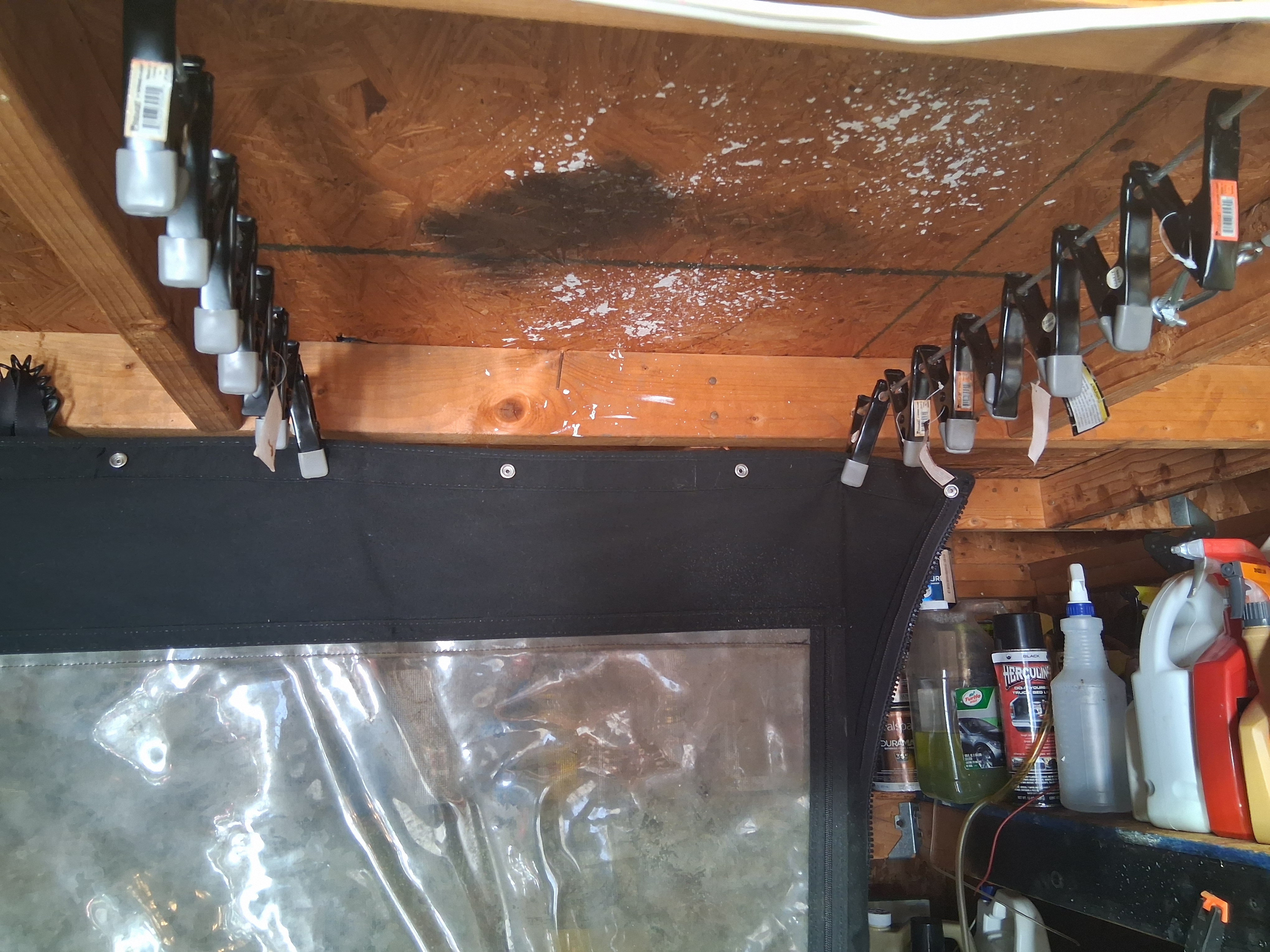 What i did for my boat...my camper pck which keeps getting messed up in the boat now is hanging up in my shed. I hate not keeping it in the boat. I don't want to leave it up all the time either. I have 3 rows of clamps on cables. The clamps can slide along the cable so i have access to the shelves in the back.