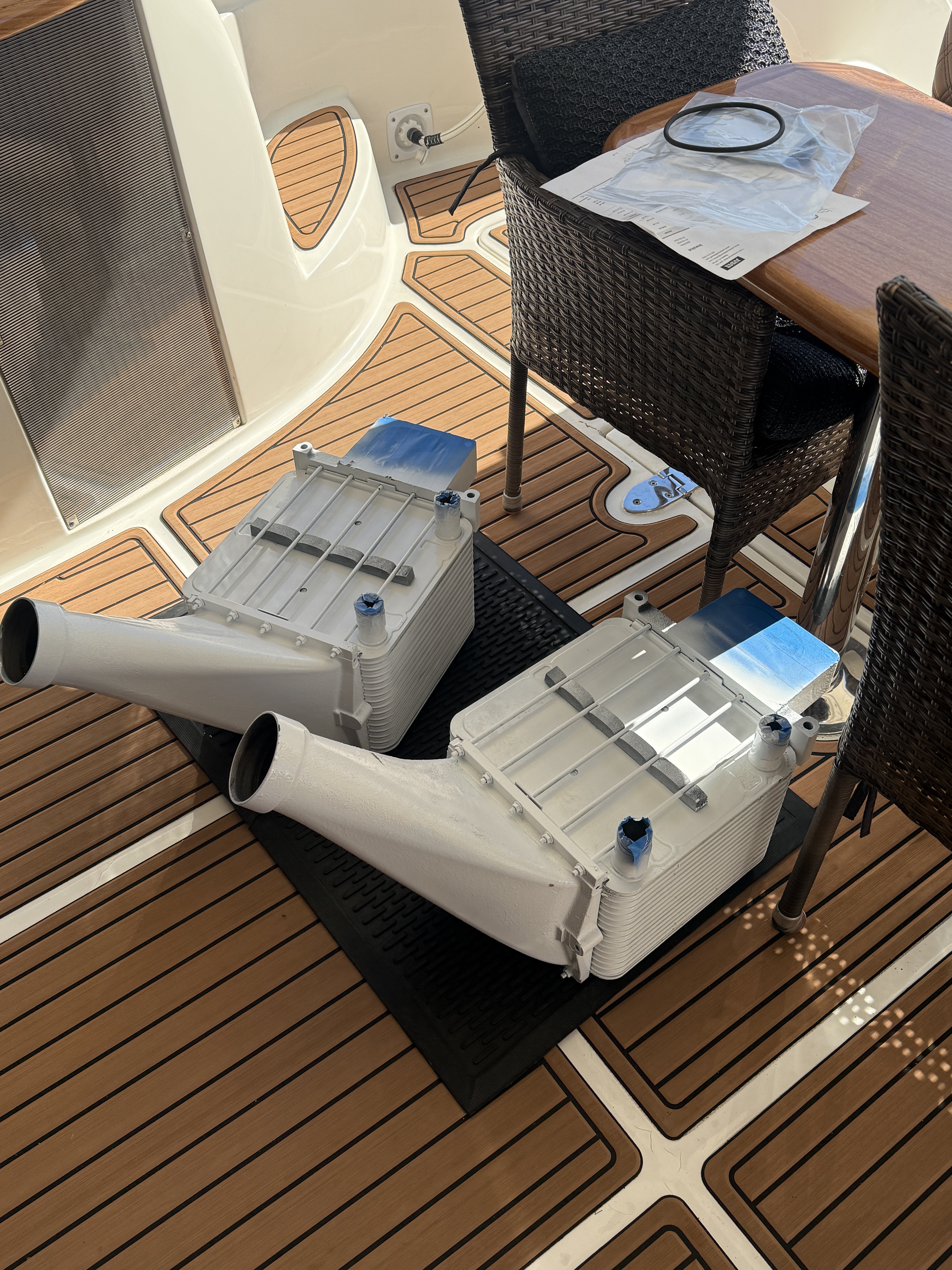 I've been tracking that my turbo boost on the port side was down about 10% compared to the other engine.  I swapped the sensors and it didn't change, so that's a sure sign that the aftercoolers need attention.  The previous owner didn't keep great records, but I think it has been 1700 hours and almost 4 years since they were serviced.  It was time.