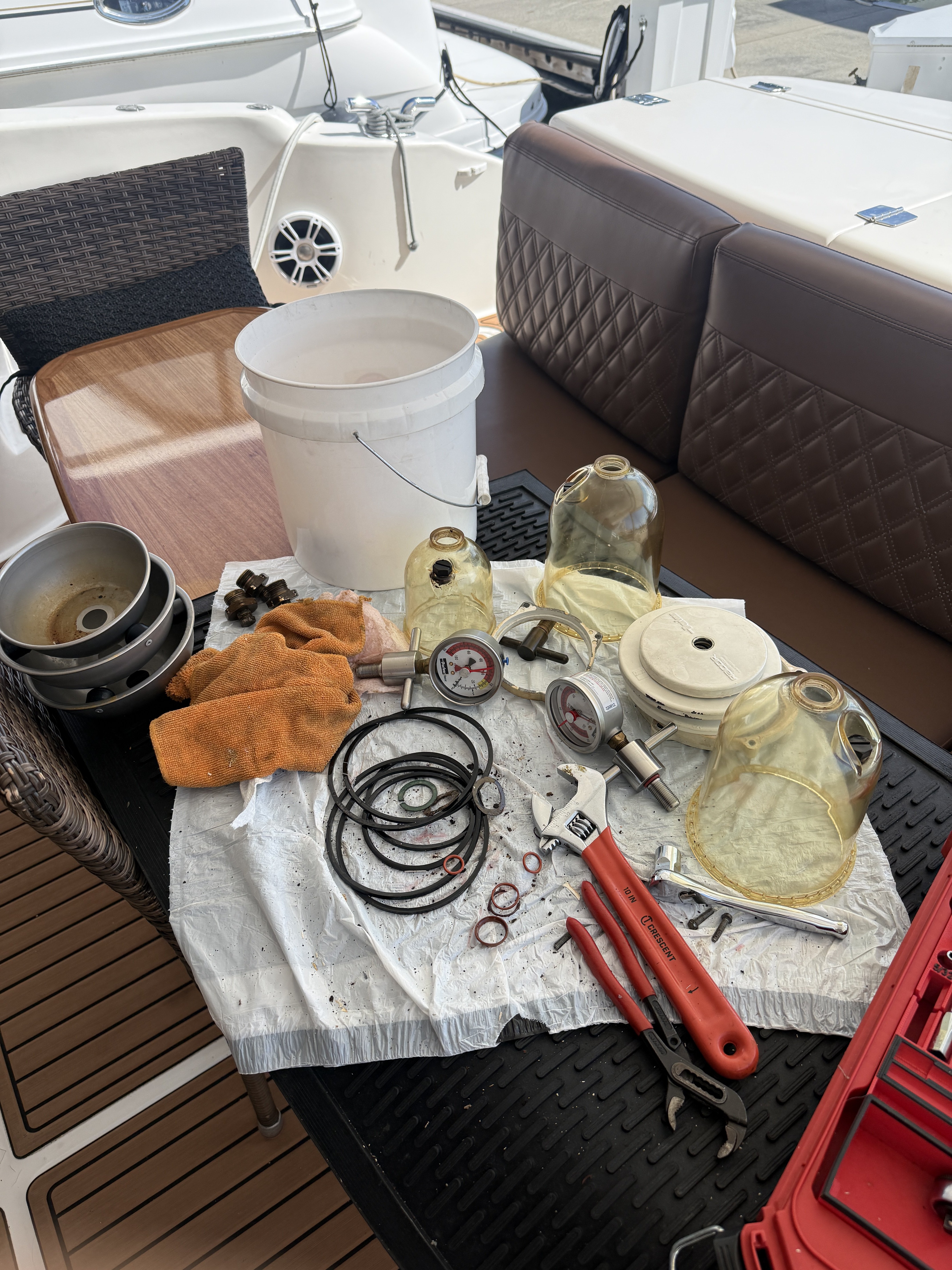 That was a big job.  First step is draining 10+ gallons of coolant from each engine, so the engine room has been full of 5-gal buckets for the past week.  And of course I made a giant mess that I cleaned up today.