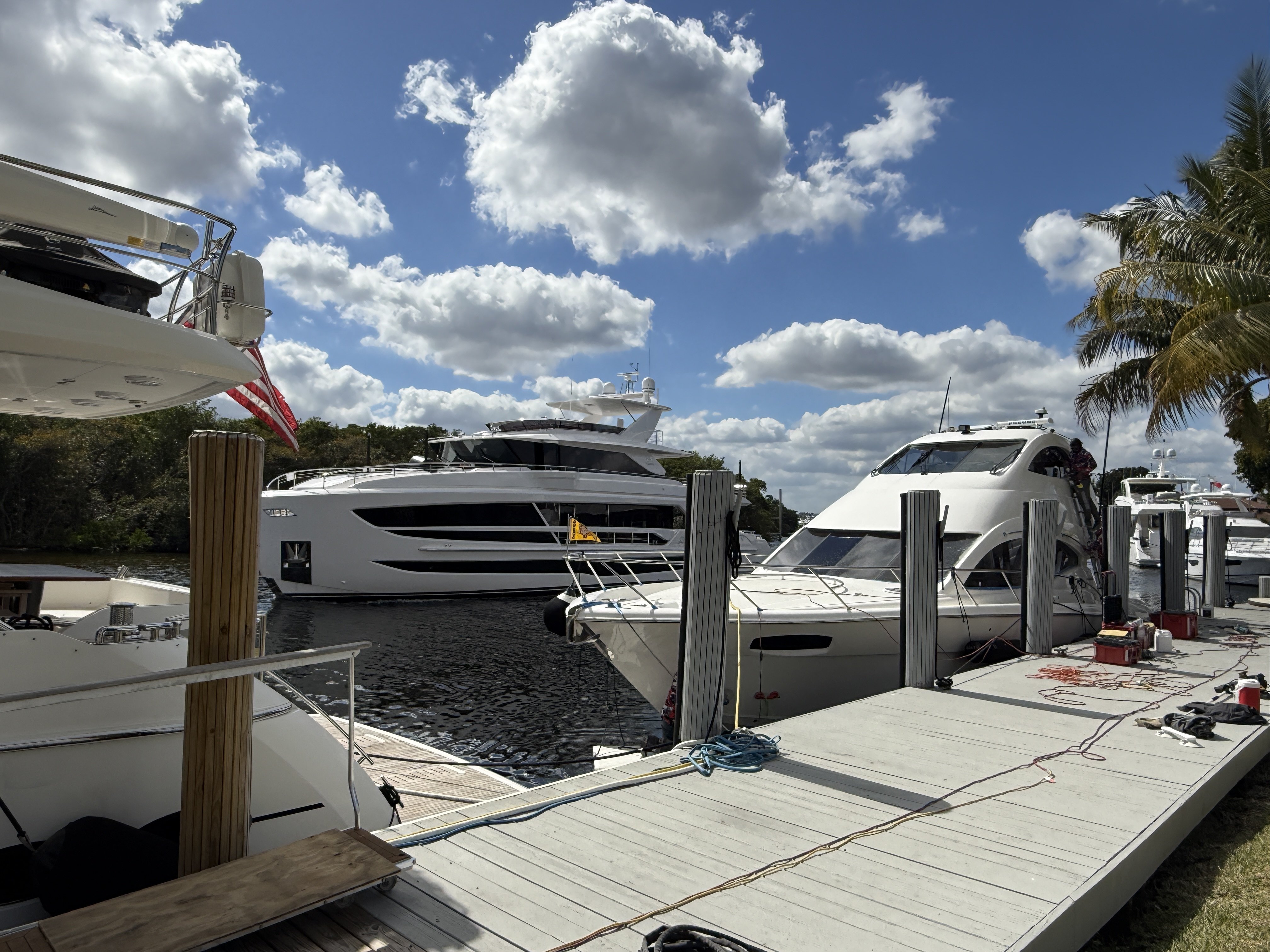 This spectacular 100-foot Horizon FD100 is making her way down the New River here in Fort Lauderdale. If you study the photo closely, you can see our wee little Maritimo in the foreground getting detailed.