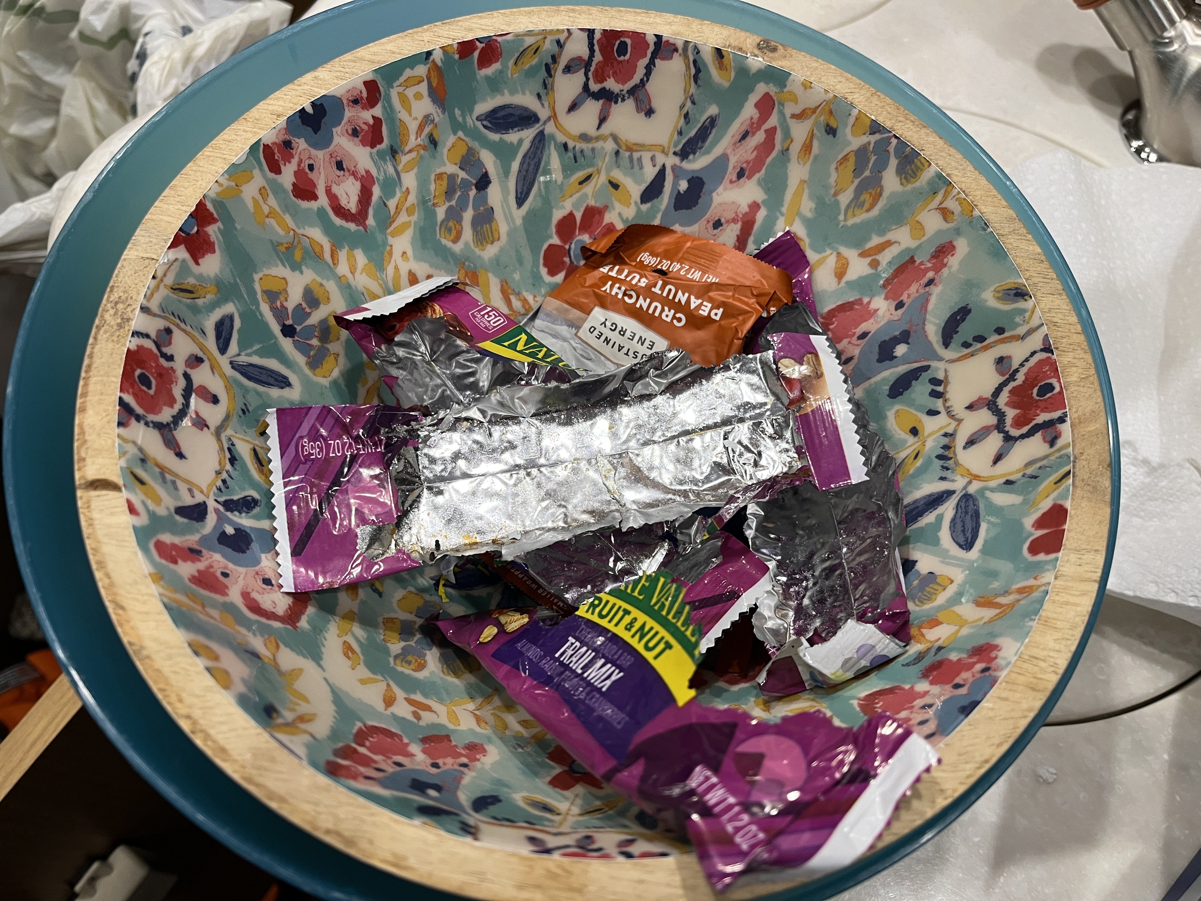 Got to the boat this morning after winter haitus. Had not been out to see it since November. It's indoor, heated. Started getting set up to do some putz work and just felt something wasn't right. Looked around and lo-and-behold -- the four or five granola bars that were in a bowl in the galley where gone and the wrappers were spread like confetti all over the counter. I then started noticing mouse droppings.
